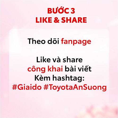 B3: Like & Share CÔNG KHAI bài viết về chương trình Minigame trên trang cá nhân kèm Hastag #Giaido #ToyotaAnSuong.