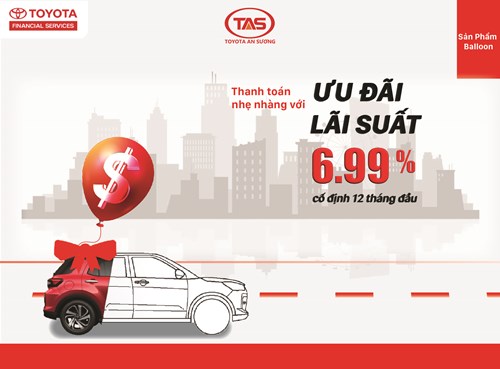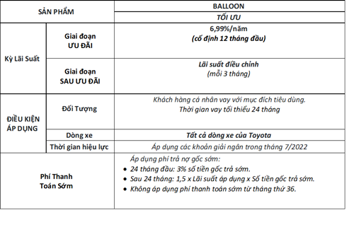Nhằm giúp khách hàng an tâm cho kế hoạch tài chính dài hạn, hiện thực hóa được ước mơ sở hữu xế hộp, góp phần nâng cao chất lượng cuộc sống, Tài chính Toyota Việt Nam (TFSVN) triển khai ưu đãi LÃI SUẤT ĐẶC BIỆT 6,99%/năm dành tặng các khách hàng mua xe Toyota, vay Toyota với sản phẩm Balloon trong tháng 7/2022.