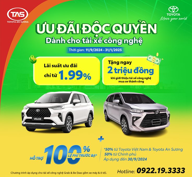 Ngoài các ưu đãi trên, tài xế công nghệ vẫn được hưởng các chương trình khuyến mại khác từ Toyota Việt Nam & Toyota An Sương nếu có tại thời điểm mua xe. Cụ thể, ngoài chương trình ưu đãi lãi suất chỉ từ 1.99%, tài xế công nghệ sẽ được hỗ trợ lên đến 100% LỆ PHÍ TRƯỚC BẠ (trong đó 50% từ Toyota Việt Nam & Toyota An Sương, 50% từ Chính phủ).
