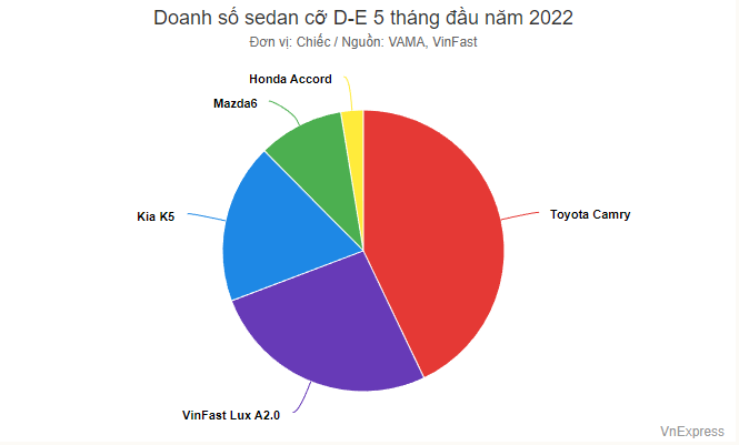 Doanh số tháng 5 của cả phân khúc giảm 267 chiếc so với tháng 4, ở mức 1.478 chiếc, dù đây là tháng cuối cùng áp dụng chính sách giảm 50% lệ phí trước bạ đối với xe lắp ráp trong nước. Trong phân khúc sedan D và E tại Việt Nam, chỉ có Toyota Camry và Honda Accord nhập khẩu Thái Lan, các đối thủ còn lại như Kia K5, VinFast Lux A2.0 và Mazda6 lắp ráp.
