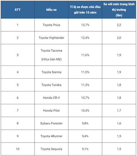 Không ngạc nhiên khi xe Nhật chiếm giữ danh sách những chiếc xe được chủ sở hữu giữ ít nhất 15 năm. Từ lâu độ tin cậy đã trở thành dấu ấn của xe Nhật.